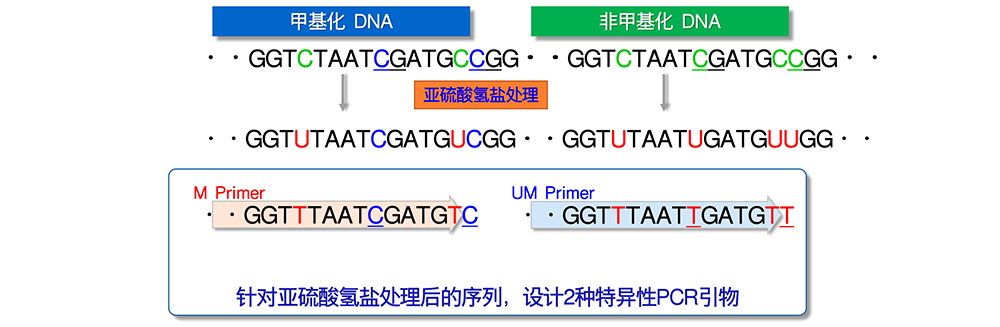 | ·通过硫化处理,CpG 序列根据甲基化与否将有所改变 ·通过设计甲基化DNA检出 Primer(M Primer) 与非甲基化DNA检出 Primer(UM Primer),进行 PCR 扩增。通过终点法PCR的电泳结果或qPCR结果判断gDNA的甲基化情况。 |