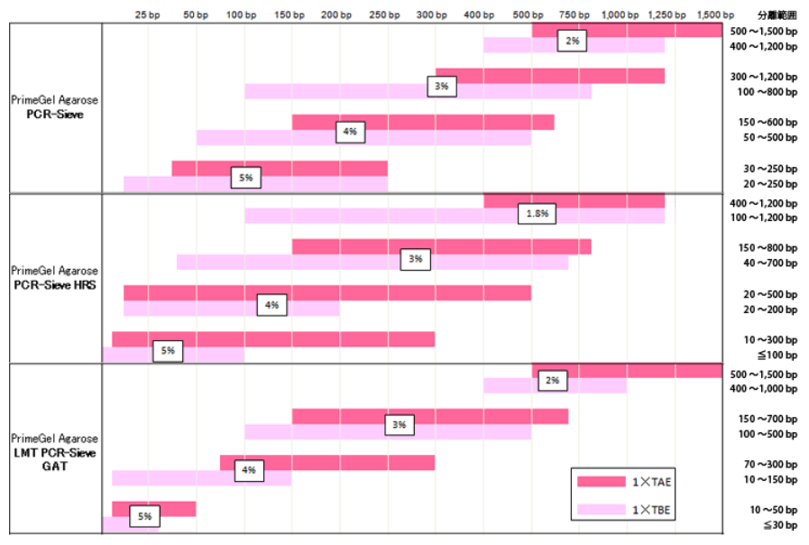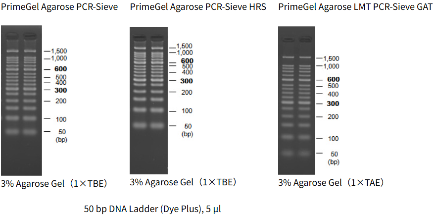 | PrimeGel™ Agarose PCR-Sieve HRS (Code No. 5812A): 该琼脂糖具有和聚丙烯酰胺凝胶类似的高分辨率。适合1 kb以下的PCR产物。它可以在TAE缓冲液(凝胶浓度为3%)中分离出150-800 bp的DNA,在TBE缓冲液(凝胶浓度为3%)中分离出40-700 bp的DNA。 |