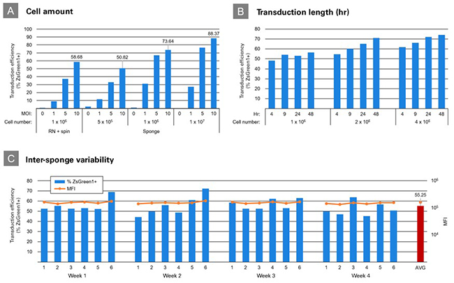 | Lenti-X Transduction Sponge在不同的细胞数量和转导时间的情况下表现出一致的转导效率,不同海绵间的变异性低。图A. 使用ZsGreen1慢病毒,以特定感染复数(MOIs) 去转导一定数量的Jurkat细胞,分别使用RetroNectin试剂+ spinoculation (RN + spin)操作流程或者转导海绵转导24小时。图B. 使用ZsGreen1慢病毒,通过转导海绵转导不同数量的Jurkat细胞4、9、24或48小时(MOI=10)。图C. 使用ZsGreen1慢病毒(MOI=2.5)转导1×106个Jurkat细胞,每周重复6次,持续4周,以评估板间变异性(%CV=12.6)。在所有实验中,ZsGreen1的表达是在转导48小时后使用流式细胞仪检测确定ZsGreen阳性细胞的百分比和平均荧光强度(MFI)来分析确定的。ZsGreen1在所有重复中的平均表达量用红色表示(AVG)。 |