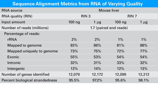 | 选择不同品质(RIN3和RIN7)的小鼠肝脏RNA样本,分别以100 ng和1 μg的样本量起始,使用该试剂盒制备RNA-Seq文库。结果显示,不同起始量,不同品质的样本之间的测序mapping率以及基因检测数的差距不大。而且转录本的链识别率均在95%以上。 | ||||||||||