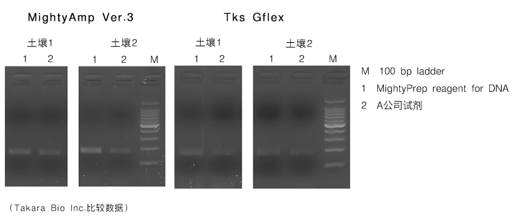 将0.3 mg 的2种土壤使用MightyPrep reagent for DNA和A公司试剂制备DNA提取液,使用下述PCR酶对16S rDNA进行PCR扩增。 |