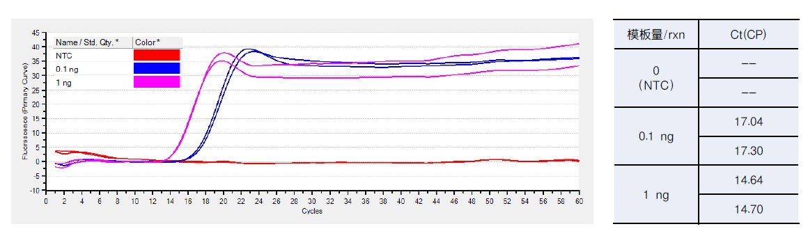 | RNA模板:Human Brain Total RNA Target Gene:ACTB [(human)] 试剂:BcaBEST™ DNA Polymerase ver.2.0(RR380A)+ 30 U/rxn PrimeScript™ III RTase with TB Green Dye 反应温度:63℃ 结果表明: PrimeScript™ III Reverse Transcriptase可以在更高的温度(up to 55℃)下进行反应,在RT-LAMP方面也具有较好的应用性能。 |