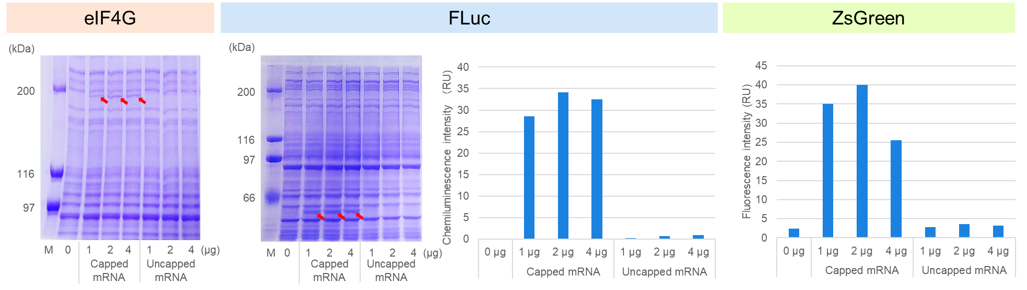 | ·向Human Cell-Free Protein Expression Master Mix for mRNA无细胞表达系统中,分别添加3种蛋白质对应的加帽mRNA*和非加帽mRNA,对应表达三种蛋白质:elF4G,FLuc和ZsGreen。(elF4G: 170 kDa, FLuc: 61 kDa, ZsGreen: 26 kDa) ·mRNA加量分别为1 μg、2 μg、4 μg。 ·32℃下孵育3小时,进行SDS-PAGE和荧光强度测定。 结果显示,仅在加帽mRNA的表达结果中确认了目标蛋白质的高表达。说明该无细胞表达系统,mRNA的表达是加帽依赖性的。此外,添加2 μg mRNA时表达量最高。 |