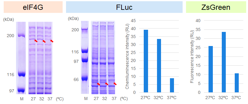 | ·向Human Cell-Free Protein Expression Master Mix for mRNA无细胞表达系统中,分别添加3种蛋白质对应的加帽mRNA*。对应表达三种蛋白质:elF4G,FLuc和ZsGreen。(elF4G: 170 kDa, FLuc: 61 kDa, ZsGreen: 26 kDa) ·在27℃、32℃及37℃下孵育3小时。 结果显示,蛋白质表达量最大对应的温度分别为:eIF4G在27℃和32℃,FLuc在27℃,ZsGreen在32℃。这表明,在该无细胞表达系统中,最佳反应温度因蛋白质而异。 |