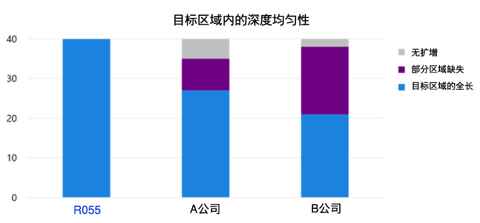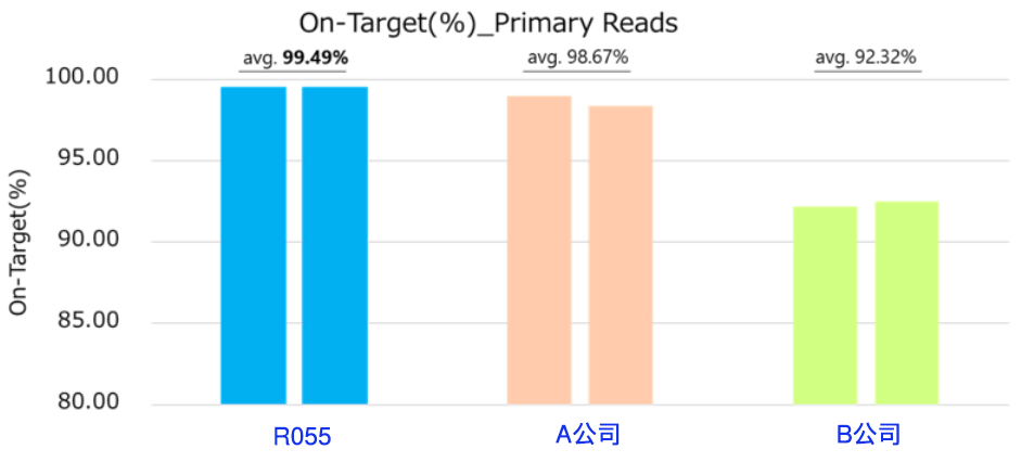 | 根据生成的序列读数,计算了各酶的靶向区域覆盖。 使用R055扩增的产物显示出99%以上的靶标覆盖率,表明R055在长链多重PCR中具有较高的特异性扩增。 | ||
