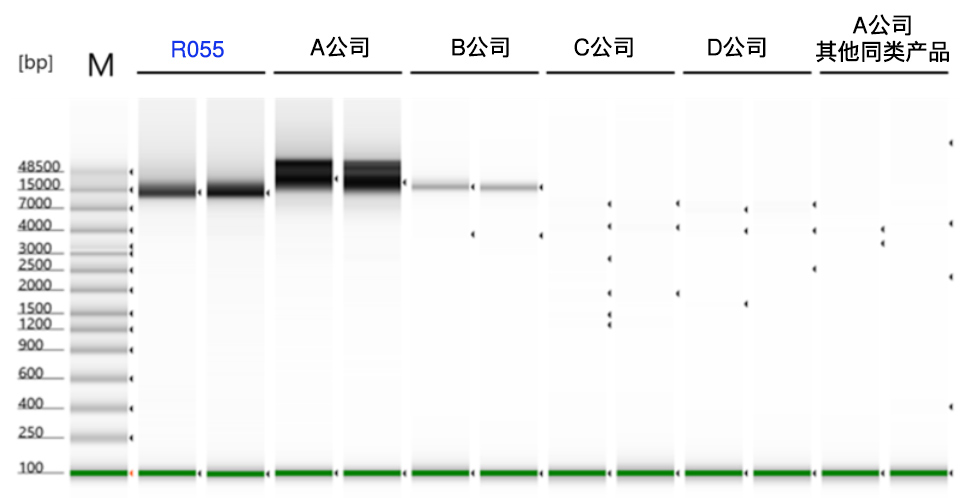 | 图2. 20重片段的多重PCR 在纯化多重PCR产物后,使用4200 TapeStation System(Agilent Technologies)进行分析。结果表明使用R055可以特异性地扩增10~12 kb附近的片段。 | ||