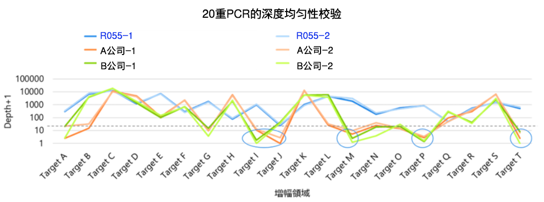 | 在多重PCR中,各PCR靶标的扩增效率差异是一个问题。 我们确认了在各个PCR 酶的扩增产物中是否含有20个靶标的序列。 通过使用R055可以用于实现更均匀的扩增。相比之下,其他公司的PCR酶在多个靶标上没有产生深度或产生极低的深度,但使用R055可以获得更少偏差的均匀深度。对于难以扩增的区域,即使增加测序量也难以改善,测序成本会上升。 使用R055可以减少多重反应PCR的优化工作,并能够以更小的测序量进行分析。 | ||