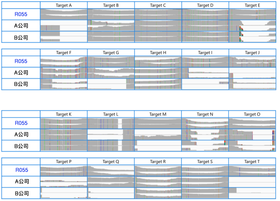 | 使用Integrative  Genomics Viewer(IGV)来确认各酶的多重PCR扩增产物中是否包含20个靶标序列。R055可以在所有20个靶标上进行全长扩增,但其他公司的PCR酶缺少部分区域,只能在68-78%的靶标上进行全长扩增。 *未获得靶标L读数的区域属于用于验证的人基因组DNA中已知的大缺失区域(976 bp)。 | ||