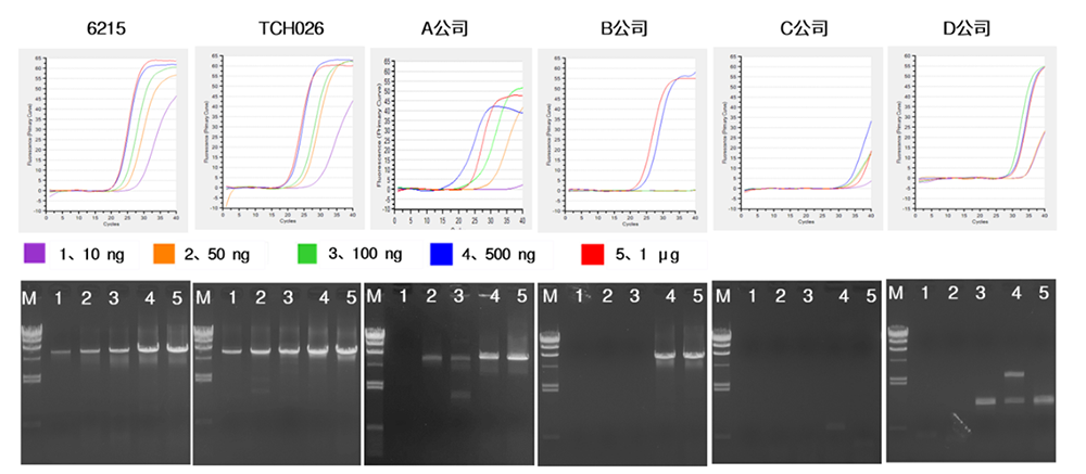 | 以Mouse Heart Total RNA 1 μg、500 ng、100 ng、50 ng、10 ng为模板,使用TCH026及其他公司同类产品反转录获得cDNA,以cDNA为模板分别对DMD基因6 kb进行扩增性能评价。 |